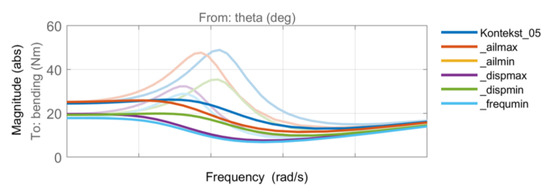 Closing the loop, the conjugate complex pole pair of the first wing bending mode is considerably damped, as visible in Figure 14, while the remaining system dynamics are not or only marginally affected. To evaluate the achieved WRBM reduction, a white noise vertical gust excitation was simulated by pitching the wing. For each model, the expected variance of the resulting WRBM with and without gust load alleviation controller was computed. The corresponding WRBM reduction is depicted in Figure 15. It can be seen that the wing statically optimized for maximum aileron effectiveness (ailmax) yields the maximum load reduction of around 28%. Furthermore, the open- and closed-loop frequency responses from the commanded pitch angle, representing the change in angle of attack for gust simulations to the WRBM, are compared in Figure 16. The achieved WRBM reduction not only at resonance frequency is clearly visible, where it is noted that the models optimized for minimum aileron effectiveness (ailmin) and minimum tip deflection (dispmin) are identical.