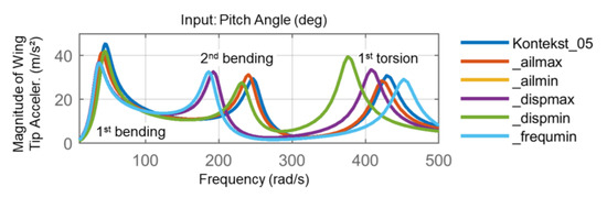 Transfer functions from pitch angle to wing tip acceleration.