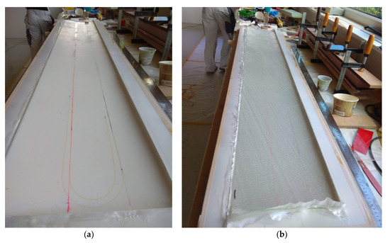 Placement of the strain fiber (a) and a 15° unidirectional (UD) glass layer (b).