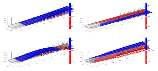 Here, the control inputs are the command signals for the servos driving the three trailing edge flaps and the measurement outputs are eight vertical accelerations measured at the outer part of the wing, as depicted in Figure 13. The input and output blending vectors and with were derived for each model separately using the algorithm described in [32]. As SISO controller, a proportional-integral (PI) controller was chosen. The respective proportional and integral gains and were selected such that the first wing bending mode was damped without or only marginally affecting its natural frequency. Subsequently, the magnitude of the feedback gain was increased until the flap deflections reach a limit of for a harmonic gust excitation of 5° amplitude at resonance frequency, which is considered as a worst-case excitation. Note that for the selected feedback gains , the classical gain and phase margins at the blended inputs or blended outputs are far beyond common minimum requirements of 6 dB and 45°, respectively. Eventually, the resulting modal controller is given as