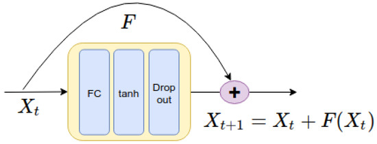 where N is the number of layers in the network architecture, and is the output from each ResNet block at time t. and are the weight matrix and bias at each layer, respectively. The ResNet propagation starts from step with the nonlinear activation function tanh. The initial input layer for the network is . For a standard ResNet in image classification, a convolution layer (CNN) is often included in a residual block. In our work, we use a simplified version of the ResNet that does not include CNN.