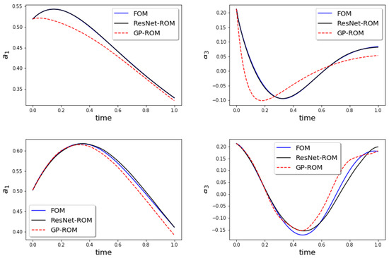In Figure 4, we plot the the time evolution of the ROM coefficients a for the FOM, GP-ROM, and ResNet-ROM. The plots show that the ResNet-ROM is significantly more accurate than the standard GP-ROM.