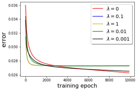 where the regularizer R penalizes undesirable parameters and can prevent overfitting, is the output from the neural network, W and b are weights in the network, is the Frobenius norm, and is a hyperparameter for the regularization to prevent overfitting [36,37]. The minimization problem (9) is over the parameters defining the structural form of the function f used to define .