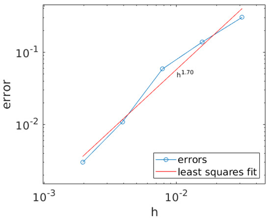 We also investigate the ResNet-ROM rate of convergence with respect to the meshsize h. To this end, we fixed the ResNet-ROM dimension at and the time-step size at . The plot in Figure 9 shows that the rate of convergence (obtained with a least squares fit) is about , which is an acceptable approximation to the theoretical rate of convergence of .