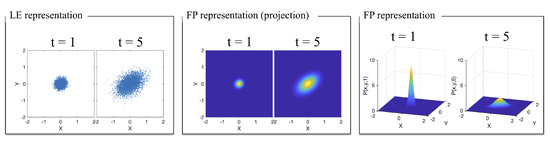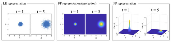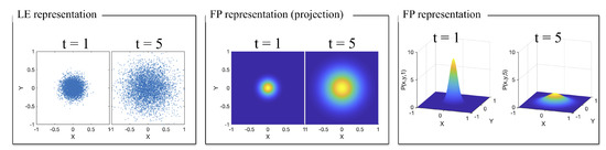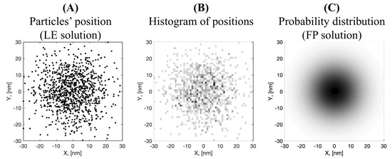 To elucidate the relation between these two types of approaches, Figure 1 shows the relation between a LE and a FP description of particles moving as a result of simple Brownian motion in two dimensions. This process describes the random migration of small particles arising from their motion due to thermal energy. The term Brownian motion was coined after the botanist Robert Brown, who was the first to describe this phenomenon in 1828 during his investigation of the movements of fine particles, like pollen, dust, and soot, on a water surface. In 1905, Albert Einstein explained Brownian motion in terms of random thermal motions of fluid molecules bombarding the microscopic particle and causing it to undergo a random walk [1]. Nonetheless, the range of applications of Brownian motion goes beyond the study of microscopic particles and includes modeling of thermal noise, stock prices, and random perturbations in many physical, biological, and economic systems [2,3]. From an observational point of view, the Langevin equation is easier to understand than the Fokker–Planck equation. The LE approach directly uses the concept of time evolution of the random variable describing the process; in the case of Figure 1, this corresponds to the individual particle’s position. In contrast, the FP approach follows the time evolution of the underlying probability distribution. That is, instead of describing a particle position, it describes the likelihood of finding a particle at a given position.