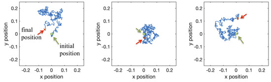 Evolution of 2D particle position for three different solutions of Equation (1). All three trajectories start from an initial position . In all three figures, = 0.001 and the simulation ran for 1000 time steps.