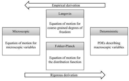 As discussed in the previous section, when a system is described by an LE, a complete description of the macroscopic system will require the solution and averaging of many SDEs. An equivalent approach is to describe the system by macroscopic variables which fluctuate as a result of stochasticity, instead of describing the individual evolution of stochastic probes [11]. An excellent explanation of the different representations and their characteristics can be found in Risken’s book [11], which we summarize in Figure 4.