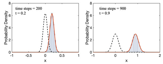 Figure 5. Probability density function (PDF) for position of particles diffusing via one-dimensional Brownian motion. Histograms correspond to LE data and solid lines corresponds to FP solutions. In this figure, m/s. - Brownian motion with external field for small particles ()A common example of an external field is a background velocity, u, which imposes a drift on the particles:The corresponding FP equation is the advection–diffusion equationThe solution of this PDE is [13]A comparison between Equations (19) and (22) shows that the only difference between these two solutions is in a “shift” of x by . That is, the effect of drift is to move the mean of the Gaussian distribution from zero.As before we can calculate the first and second moment of the distribution function as [13]That is, the mean position of the particle is displaced by the background velocity over a distance . In addition, note that the MSD at long times becomes due to the additional linear flow in the fluid.In the case of simple diffusion, the dispersion of the particles can be attained from the MSD or equivalently the variance of the Gaussian. In the case where drift is present, dispersion is superimposed by the background flow, for this reason a more accurate measure of the dispersion is given by the metric [13]which gives back the linear behavior characteristic of standard diffusive processes. Note that in this equation, is a central moment as opposed to the general definition given at the beginning of Section 2.1. These two moments will coincide if the mean is zero.Plots of Equation (22) are shown in Figure 6, where the solutions with drift are compared to solutions without drift.