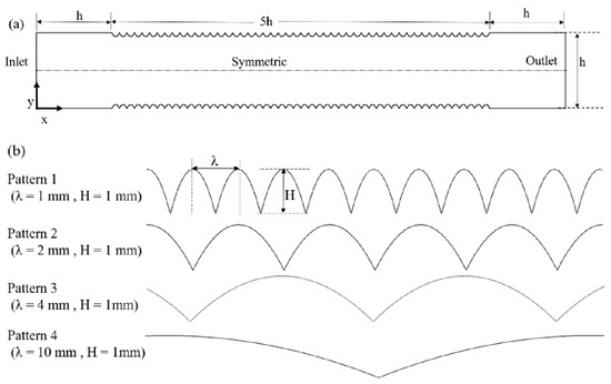 Figure 1a, it has a 20 mm long entry region, a 100 mm long test surface with repeated arc-shaped ribs, and a 20 mm long region for exit. The arc-shaped two-dimensional ribs with identical height but four different pitch-to-height ratios (λ/H) are shown in