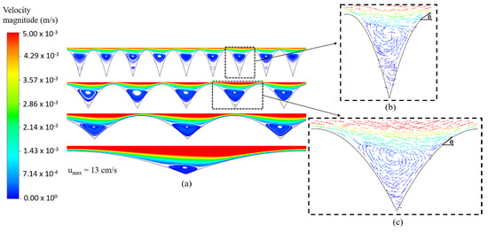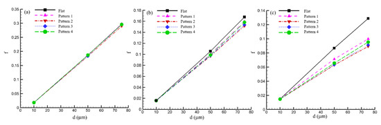 Well-mixed particle-laden fluids are used in many studies of particle transport and deposition in channel flows. To ensure a nearly uniform particle concentration, a flowrate-weighted particle distribution is applied when injecting particles from the inlet. However, this approach is not employed in this study because of the dependence of particle placement over the inlet on the flow velocity and the velocity profile. As our focus in the current study is how surface features affect the attachment of the particles, we aim to conduct numerical tests that highlight the effect of surface structures while minimizing the influence of other factors such as initial placement of the particles and particle concentrations. In light of this consideration, 1000 particles that are uniformly distributed in space are injected from the inlet of the channel every 0.5 s for 150 s in the numerical tests. Further increasing the number of the injected particles to 2000 every 0.5 s leads to less than 1% difference in the fraction of the particles that adhere to the surface. A time step of 10−4 s is chosen for the numerical integration of Equation (3). Further halving the time step yields a less than 0.1% difference in the fraction of particle deposition. A second-order implicit scheme is used to integrate Equation (3) for particle velocity and location.