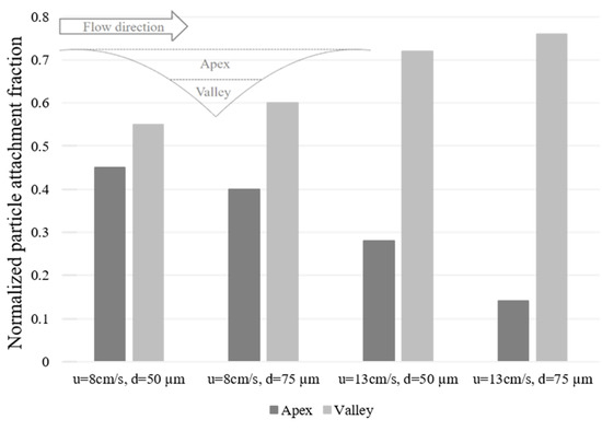 Figure 8 shows that at 8 cm/s, the amount of 50 micron particles settled in the valley is slightly higher than that in the apex. In contrast, most 75 micron particles fall in the valley at 13 cm/s. The distribution of the larger particles in the high velocity flow is more sensitive to the surface topography.