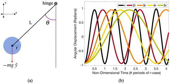 (a) A pendulum of length L with circular bob of radius, r, and mass, m. (b) Angular displacement (in radians) over time for various gravity pendulums of differing radii. The non-dimensional time is given in terms of the number of periods of the case with radius, r.