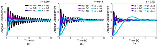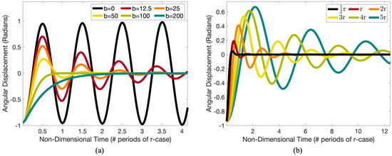 Figure 2a holds the radius constant at r, the same r from Figure 1b, while varying the damping coefficient, b. Compared to Figure 1b, angular oscillations decay in all cases when . The damping induced from will eventually lead to its equilibrium—a stationary pendulum hanging straight down. However, the decay rate is dependent on b; larger values of b lead to a quicker decay of oscillation. Note that b has units of and in realistic situations, . Moreover, depending on the value of b, the pendulum system will exhibit one of three behaviorial cases: