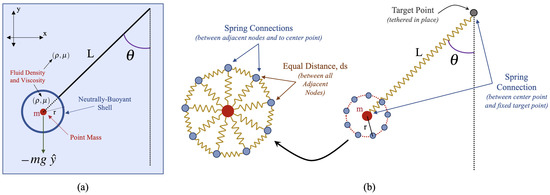 Figure 3 presents our pendulum model’s computational geometry. In particular, Figure 3a illustrates the modeling idea—a bob (of radius r) is composed of a central point mass (of mass m) and outer neutrally-buoyant shell layer. It is tethered to a particular fixed location, a distance L away. The pendulum is immersed in a viscous, incompressible fluid of uniform density , and dynamic viscosity, . Note that the fluid within and outside the pendulum bob is uniform in its properties. We define the pendulum’s angular displacement, , to be the angle from the vertical dotted line. Gravity acts on the central mass point; as the rest of the pendulum bob’s geometry is neutrally-buoyant, all acceleration of the bob is due to this single gravitational interaction. However, due to the structure properties of the pendulum bob, the neutrally-buoyant shell will undergo fluid drag due to the fluid’s resistance in letting the pendulum bob move through it.
