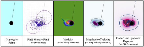 Snapshots of a single moment in time for a pendulum with mass, , and radius, , providing some of the data stored during the time-step in which the simulation time reached , i.e., positions of Lagrangian points (pendulum), the velocity vector field, magnitude of velocity, and vorticity. Note that data from giving the force spread from the Lagrangian grid (pendulum) onto the Eulerian (fluid) grid is not shown. Lagrangian Coherent Structures (LCS) via finite time Lyapunov exponents (FTLE) are also illustrated, although they were computed during the post-processing stage, after the data was collected.