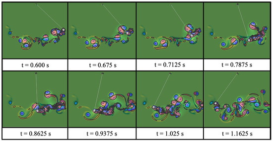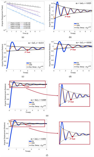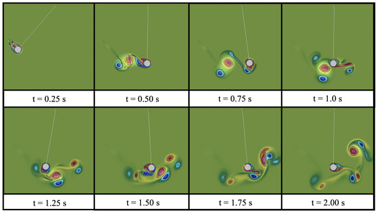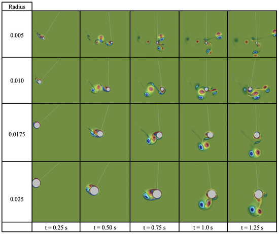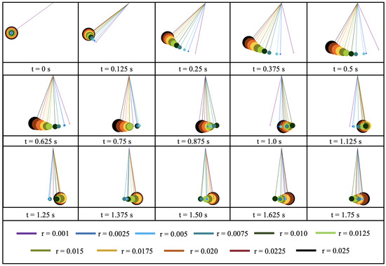 As suggested from Section 1, since the pendulum is immersed within a fluid environment, its oscillation amplitude will decay over time. Figure 5 provides snapshots of multiple pendulums’ angular displacement over time for pendulum bobs of differing radius and . Note that all simulations were run independently of each other and Lagrangian position data is being overlaid during post-processing.