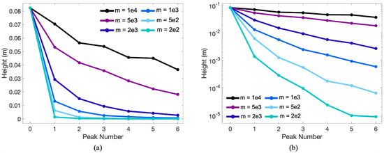 (a) Plot illustrating the decay of the height (m) that the pendulum bob reaches as the pendulum continues to swing for the case of for a spectrum of masses. The peak amplitude decays exponentially as illustrated by the linear relationship between the logarithm of the amplitude against peak number, as shown in (b).