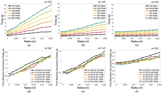 Plots illustrating the time of the peak in angular displacement against the pendulum bob’s radius for its 1st through 6th peak (a–c) and the time difference between the peaks (d–f) against the pendulum bob’s radius for three different masses: (a,d) , (b,e) , and (c,f) .