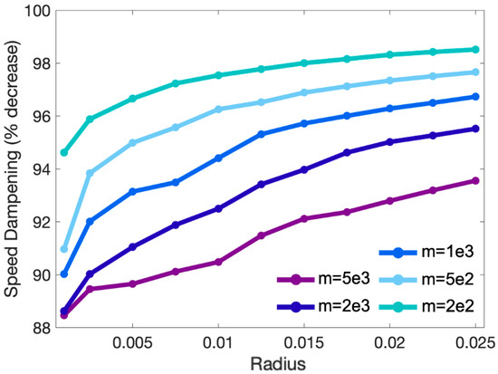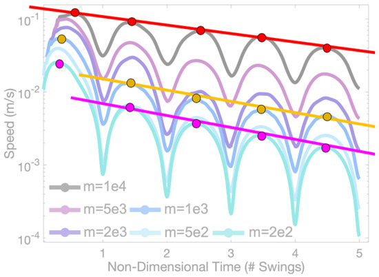 Furthermore, from Figure 10b, it does not appear that the speed peaks decay exponentially over time from the beginning of the simulation. After a few swings, the peaks in speed appear to satisfy a linear relationship between the logarithm of speed versus time; however, the peak speed significantly decreases from the first to second swing, see Figure 11. Figure 11 illustrates that for most cases from the second swing on, the peak speeds approximately demonstrate exponential decay; however, there is significantly more decay between the first and second swing than successive peaks thereafter. Figure A3 presents the counterpart data of how the speed of pendulum bobs of the same mass decays over time for a variety of radii. Similarly trends are observed in the data.