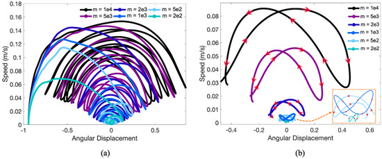 Furthermore we also provide more detailed phase space explorations of linear speed () versus angular displacement (radians) in Figure A4 and Figure A5. Figure A4 provides the phase space of linear speed versus angular displacement for the case of and a variety of radii, while Figure A5 selects four radii (, and ) and varies mass. Similar topological structures are observed, where the data collapses onto a parabolically-capped cone. This is intuitive as both the peaks in angular displacement and speed decrease over time; however, what is particularly interesting is that the cone angle looks to be approximately conserved among all cases.