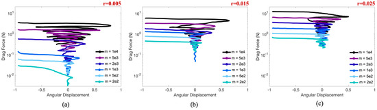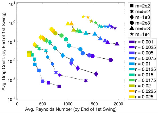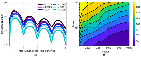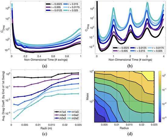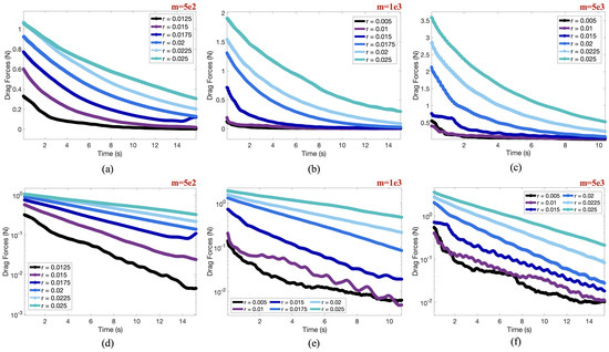 Finally we provide data depicting the drag force (N) over time for 3 different radii (, , and ) over a variety of masses. Compared to Figure 14, we notice that for the same radius but different masses, the drag forces begin to overlap with time. Specifically, the drag forces corresponding to larger masses decay more rapidly. This could also be surmised from Figure 17c,d, which show an increased average drag coefficient during the higher mass cases for a specific radius.