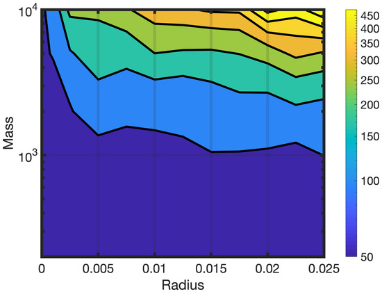 From this data, we computed the approximate damped period of oscillation, see Figure 9a,b. Figure 9b provides a colormap with contour lines of the period data from Figure 9a. As mass increases, the approximate period decreases, as suggested previously. Moreover, as radius increases, the period also increases. Note that when mass is high enough (e.g., the case of ), the period does not significantly change between different radii; however, there is still exponential decay in the oscillatory amplitude (see Figure A2). Furthermore, for very small radii there appears to be a non-monotonic trend in period as a function of mass. The period was computed by averaging the time between every other peak over the first 5 full oscillations.