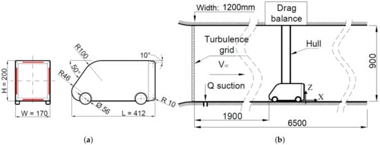 A sketch of the model and its positioning within the wind tunnel are presented in Figure 1b. The model is positioned 1900 mm downstream the inlet section through an instrumented strut attached to the model roof and directly connected to the balance.