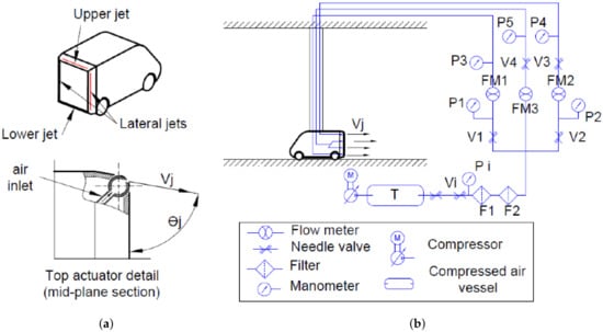 The jet orientation was maintained constant and equal to 65 for all the forced configurations while the jet velocity was varied. The blowing speed for the upper and lower jets were independently controlled by the valves (V1–V2), the manometers (P1–P2), and two flow meters (FM1–FM2), as displayed in Figure 2b. The two lateral jets slot were instead simultaneously controlled through V4–FM3–P5 devices.