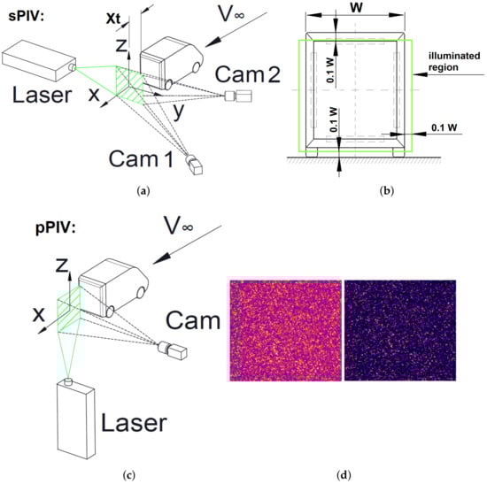 The images of tracing particles were preprocessed to remove the historical minimum, to attenuate the effect of laser reflections on the wind tunnel walls and on the model (see Figure 3d). Image deformation and velocity vector field interpolation were carried out using spline functions [38,39]. A Blackmann weighting window was used during the correlation process to tune the spatial resolution of the PIV process [40]. The final window size is 64 × 64 pixel (corresponding to 3.55 mm × 3.55 mm), with 82% overlap. Considering the subpixel accuracy of the PIV process, and comparing it to the typical value of the mean flow component in the present investigation, we could assess that the average error on the velocity components is much smaller than 1%.
