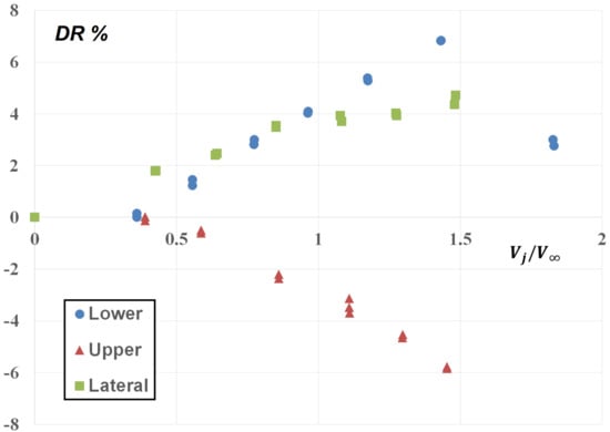 We start by investigating the case of single jet actuation. This helps to assess the effects of the single jets on the flow field; furthermore, it may give an indication on the most effective one in terms of drag reduction. We consider the following actuations: lower jet only, upper jet only, and lateral jets only (which are connected to the same flow meter and then work simultaneously). Figure 5 shows the effect of the velocity ratio on the drag reduction (, with being the drag coefficient in the controlled configuration and the drag coefficient in the natural configuration) when the lower, upper, and lateral jets are alternatively activated.