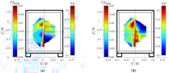 Distributions of static pressure coefficient (, right) and RMS of the pressure coefficient (, left) on the rear face: (a) lower jet forcing, = 1.4; and (b) lateral jets forcing, = 1.5. The location of the actual measurement points is schematically represented using blue and red circles for the static pressure and fluctuating pressure, respectively. The contour representation is obtained by interpolating the measurements on a structured grid.