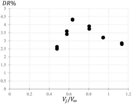 The first configuration we investigated was the symmetric case, i.e., same blowing speeds for all jets ( = = = ). In Figure 7, we present the measured as a function of the velocity ratio . As the forcing increases the drag reduction also increases up to a velocity ratio = 0.64 for which the attains a value of 4.3%. Beyond this point, the control effectiveness reduces almost linearly. Comparing the results of the symmetric forcing to the single jet case, one may conclude that the single jet actuation brings higher benefits, even without accounting for the overall system efficiency.