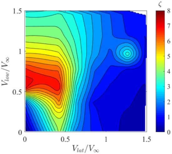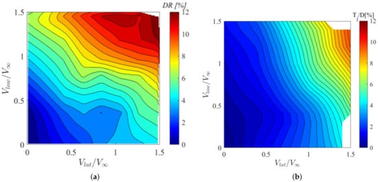 It is worth explicitly mentioning that the blowing jets have a secondary beneficial effect on drag reduction, given by the thrust that they exert. In Figure 8b, we plot the contour representation of the thrust produced by the lower and lateral jets normalized with respect to the drag in the natural case. By comparing Figure 8a,b, it is immediate to understand how a large share of drag reduction must be addressed to the effect of the blowing jets at the highest injection speeds. However, their effect is mainly limited to the range of injection speeds 1.3 and 1, where exceeds 6%. In Figure 8a, we identify the configuration leading to the maximum drag reduction (DR% = 12.7%) as = 1.4 and = 1.2.