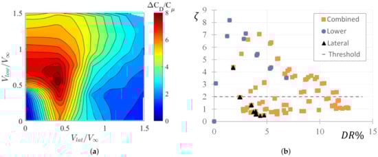 We performed a parametric study to determine the most favorable configuration, accounting only for lateral () and lower jets (). It is worth recalling that the lateral jets, in the present experiment, are always activated simultaneously and with the same injection speed. To cover a significant portion of the parametric space, we varied the jets’ speed in the range . As evidenced in Figure 8a, high actuation speeds are the most effective in terms of drag reduction as already evidenced in the literature for different vehicle geometries [24]. It is interesting to notice that, similar to what was already proposed when investigating the single jet actuation, the lower jet is still very effective even with little influence of the lateral jets. However, Figure 8a clearly suggests that the combined effect of lateral and lower jets leads to a drag reduction twice larger than the most favorable standalone configurations. The vehicle wake is indeed highly three-dimensional; hence, it is reasonable to expect higher efficiency when acting on the three edges simultaneously, rather than focusing only on the lower part of the wake.