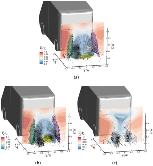 Considering the best compromise case (Figure 13b), a first significant difference can be detected by looking at the iso-surface of streamwise velocity. The effect of the lower jet is such that the bubble is deflated in its lower part. Indeed, the momentum injected from the lower jet reduces the shear rate between the underbody flow and the low momentum region. Conversely, the lateral jets do not significantly affect the flow structure, at least from the qualitative standpoint, thus suggesting that the lower jet is the most effective in terms of drag reduction. Despite this difference, the entrainment of high momentum fluid leads to the roll-up and the production of the two streamwise structures.