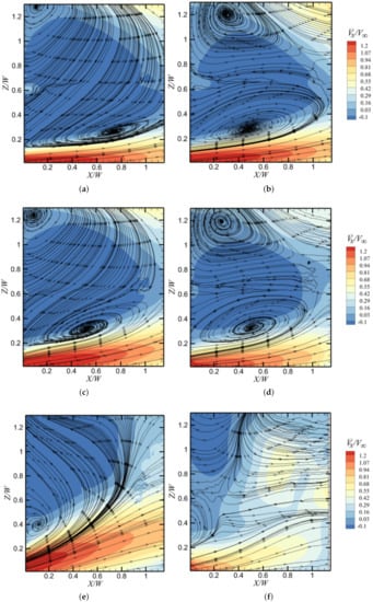 Relevant information about the streamwise organization of the flow field was also gathered performing pPIV measurements in planes aligned to the symmetry plane of the model (). The setup of the laser and camera is sketched in Figure 3c. The camera, equipped with a Nikon 105mm lens, images an area extending 1.1 W × 1.3 W in the X and Z directions, respectively. We carried out measurements in two planes, Y = 0 and Y = 0.2 for each configuration, acquiring 3000 images for each case. The time delay between two exposures was set to 40 s. The raw images were preprocessed in a similar fashion to the sPIV experiments. The final interrogation window size is 24 × 24 pixels (2.5 mm × 2.5 mm), with 75% overlap.