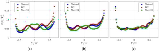 In Figure 15, we report the vertical component of the mean squared velocity fluctuation in the natural, best compromise, and maximum drag reduction cases. We present the profiles at a fixed vertical location = 0.7 and at three streamwise locations = 0.82 (Figure 15a), = 1 (Figure 15b), and = 1.35 (Figure 15c).