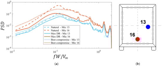 In Figure 16a, we report the plot of the power spectral density (PSD) for Microphones 13 and 16, sketched in Figure 16b, for the natural, best compromise, and maximum drag reduction configurations. The natural flow case exhibits a peak at f = 6.7 Hz, corresponding to a Strouhal number = 0.13. As is widely reported in the literature [24,25,26,31,50], this peak is addressed to the shedding occurring in the wake of a 3D bluff body. It is interesting to notice that the peak associated to Microphone 16 (near the lower edge of the vehicle) is more intense than the one related to the lateral one (i.e., Microphone 13), revealing a higher occurrence of vortex shedding from the top-bottom edges, rather than the lateral ones. In the controlled configurations, this peak progressively fades out, with the lowest intensity consistently achieved in the maximum drag reduction case.