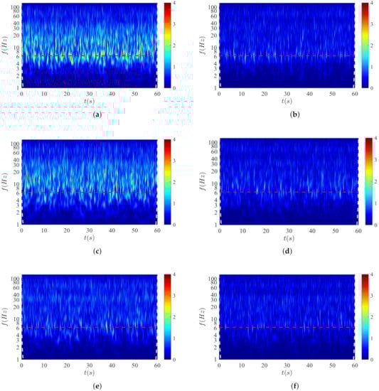 Wavelet analysis for signal from Microphone 16: (a) natural flow, (c) best compromise; and (e) maximum DR. For Microphone 13: (b) natural flow; (d) best compromise; and (f) maximum DR. Plots are color-coded according to the magnitude of the wavelet transform of the corresponding pressure signal.