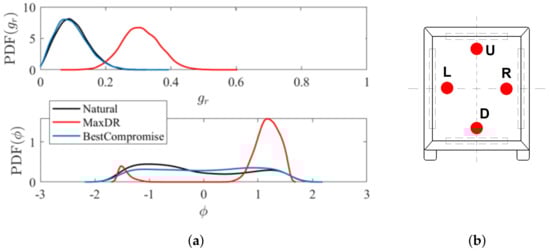 First, it is interesting to notice how the mean pressure gradient across the model’s rear base attains similar values in the natural and best compromise case, whereas the maximum drag reduction case features a nearly double value of the pressure gradient. From the results in Figure 19, we can draw some conclusions on the effect of the control mechanism on the bi-stable behavior of the wake. Even though the two peaks are not as well demarked as in the case of Bonnavion and Cadot (2018) [27], it can be argued that the natural wake has preference towards two states showing a phase offset equal to . We address the less pronounced bi-modal distribution of pdf () with respect to other investigations [25,27,50] to the different geometry of the model’s rear base, presenting slant angles on all the four edges.