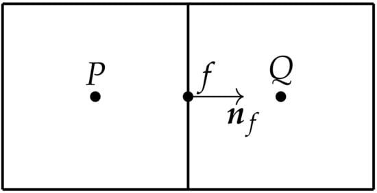 where subscript f denotes the mesh face shared by cell P and its neighbor cell Q, as illustrated in Figure 1, is the advecting velocity at face f, presented in detail in Section 4.2, is the area of mesh face f and is the unit normal vector of face f, which points out of cell P. The advected variable is interpolated using a TVD formulation, given as [36]