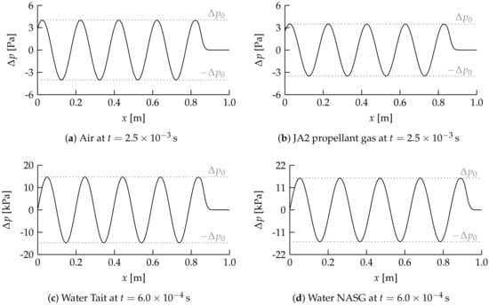 First, the propagation of acoustic waves in a single-phase flow is considered. The acoustic waves are generated by a periodically changing velocity at the domain inlet, which is defined as , where is the amplitude of the velocity perturbation and f is the excitation frequency given in Table 2. Figure 2 shows the pressure profiles of acoustic waves in each fluid shortly before the waves reach the domain outlet at . The wavelength and pressure amplitude predicted by the proposed algorithm for these acoustic waves are given in Table 2. For all cases and are in excellent agreement with the theoretical values and according to linear acoustic theory, also given in Table 2.