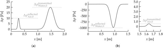 where and are the initial amplitude and the initial position of the pressure pulse, respectively. Based on linear acoustic theory [47], the pressure pulse reflected in the left phase at the fluid interface should have a pressure amplitude of