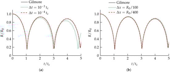 The behavior of a spherical bubble collapsing as a result of an initial overpressure in the liquid compared to the pressure in the gas bubble is considered, the so-called Rayleigh collapse [49], to scrutinize the prediction of pressure-driven bubble dynamics by the proposed algorithm. The Gilmore model [9], which is an extension of the classical RP model, for the dynamic behavior of a spherical gas bubble in a compressible liquid is used as a reference solution. The solution of the Gilmore model is, therefore, regarded as the exact solution of the dynamic bubble behavior under consideration. The dissipation due to both viscous stresses and acoustic radiation is included in these simulations, leading to a complex interplay of the hydrodynamics, e.g., viscous dissipation, and thermodynamics, e.g., energy dissipation due to the emission of the shock wave formed at the end of the collapse, which directly influences the evolution of the bubble radius. In particular, the accurate prediction of the bubble radius after multiple collapse-expansion cycles using finite-volume methods is known to be difficult to achieve [23,50].