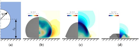 Wall-bounded cavitation. (a) Simulation setup. (b–d) Instantaneous bubble shape and velocity contours of a bubble with and at times , and , respectively. The wall is explicitly illustrated in all figures.