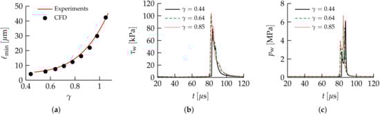 Figure 5b–d show the instantaneous bubble shape and contours of the velocity component perpendicular to the wall of a bubble with and at times , and , respectively. As the bubble initially grows and then collapses, a thin liquid film forms between the bubble and the wall, which can be clearly seen in Figure 5b–d and which has also previously been observed and measured in experiments [51]. Furthermore, the characteristic fast-moving liquid jet directed towards the wall that pierces the bubble during its collapse can be seen in Figure 5d. Figure 6a shows the minimum thickness, , of the liquid film separating the bubble and the wall at the time when the jet pierces through the bubble, i.e., the thickness of the small gap between the bubble and the wall seen in Figure 5d, predicted by the simulations for different dimensionless initial stand-off distances , in comparison with the experimental measurements of Reuter and Kaiser [51]. The fit of the correlation has a coefficient of determination of based on 91 experiments for bubbles with in the range [51]. Excellent agreement between the simulations and the experiments is observed, demonstrating the accuracy with which the proposed algorithm can predict such a complex cavitation process. The evolution of the peak shear stress and peak pressure at the wall are shown in Figure 6b,c, respectively, for selected initial stand-off distances. The pressure signal exhibits two peaks during the collapse of the bubble [52]; the first peak is caused by the pressure pulse emitted as the liquid jet impinges on the lower side of the bubble interface and the second peak is associated with the shock wave emitted at the end of the collapse, when the bubble (at this point having a toroidal shape) assumes its minimum volume. The results are in good agreement with previous studies regarding the order of magnitude of the generated wall shear stress [11,12] and the pressure amplitude of the shock wave formed as a result of the collapse [53,54] of a laser-induced bubble, with wall shear stresses exceeding for bubbles collapsing close to a wall.