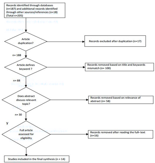 In accordance with the PRISMA flow diagram, the total number of records identified through searching was 205 out of which 17 duplications were identified and removed. Furthermore, articles were checked if they addressed the defined keywords, and 88 papers were later retained. Only 30 papers had abstracts relevant to the search criteria. Overall, 14 papers were included in the final synthesis after assessing the contents of the 30 articles, out of which 12 were articles focusing on the effects of drug properties and nebulization systems on the efficacy of drug delivery, and 2 papers were reviews on the use of CFD on inhaler devices.