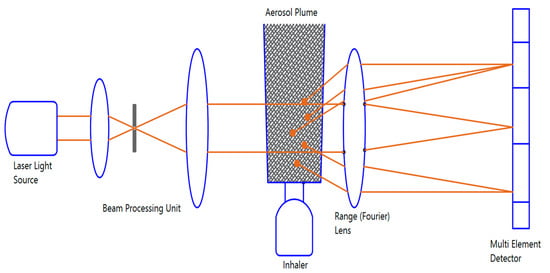 Laser diffraction (LD), or Fraunhofer diffraction, is a droplet size measurement technique that operates based on light scattering pattern interpretation, which is subsequently converted into volume weighted droplet size distribution (DSD). Mitchell et al. studied the use of laser diffractometry for measuring aerosol sizes from an inhaler device [89]. The study described the process of changing the light scattering pattern to DSD in three steps (see also Figure 2).