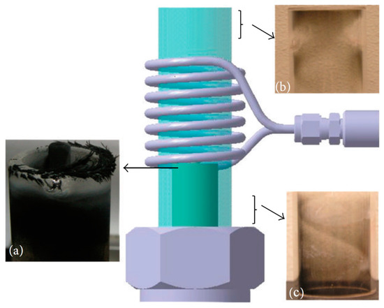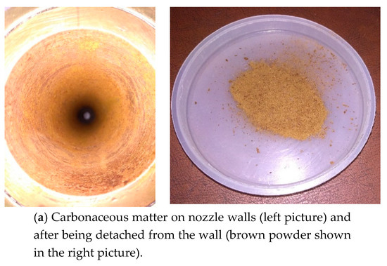 (a) On the water-cooled nozzle walls, both in the convergent and in the divergent sections, see Figure 2a; in this circumstance, the carbonaceous matter appears as a brown substance tenaciously attached to the walls;