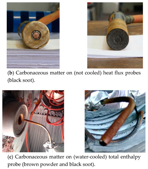 (c) On a total enthalpy probe (water-cooled), made of steel, Figure 2c; in this circumstance, the carbonaceous matter appears as a brown substance along the probe body, and as black soot in the probe stagnation tip.